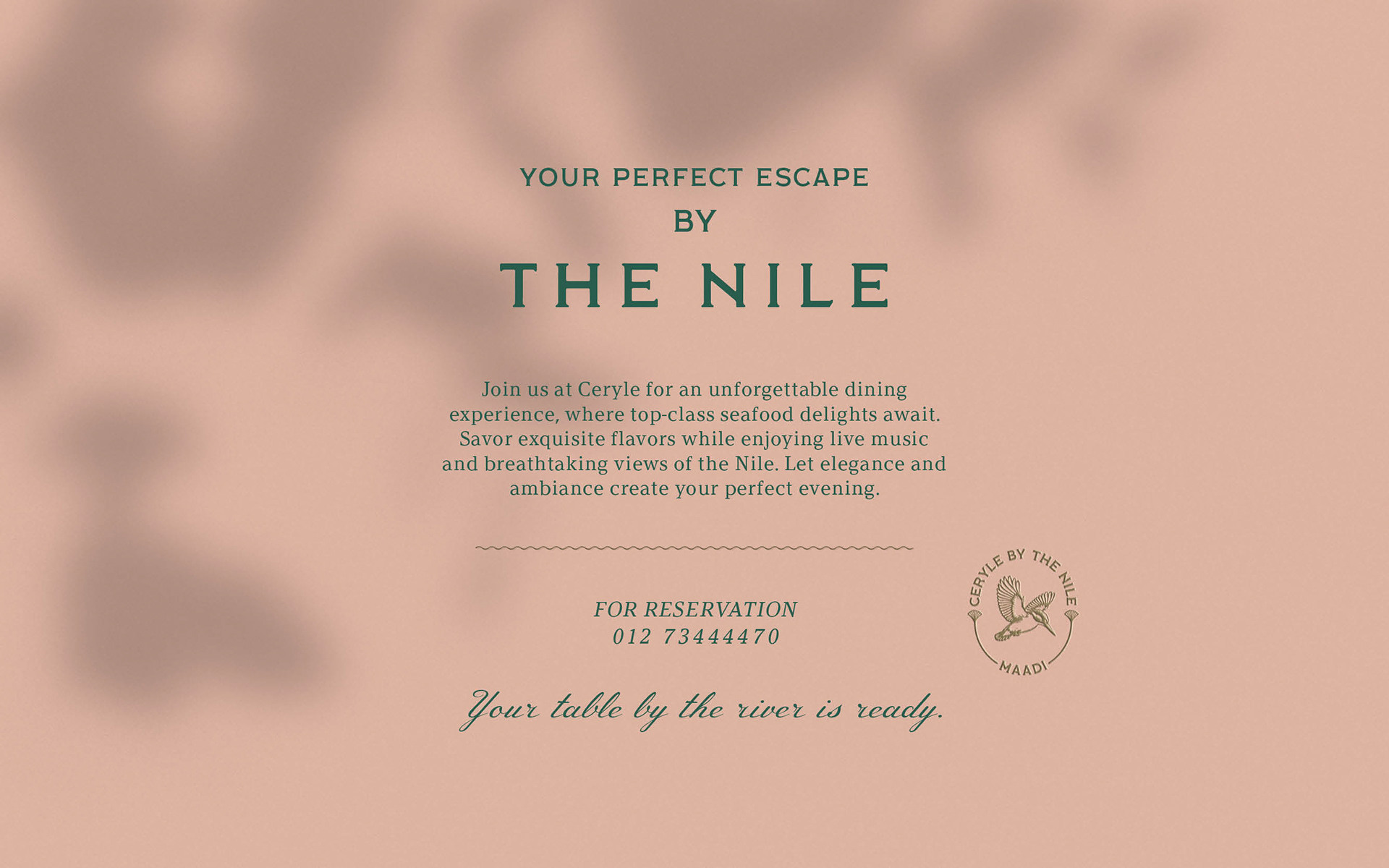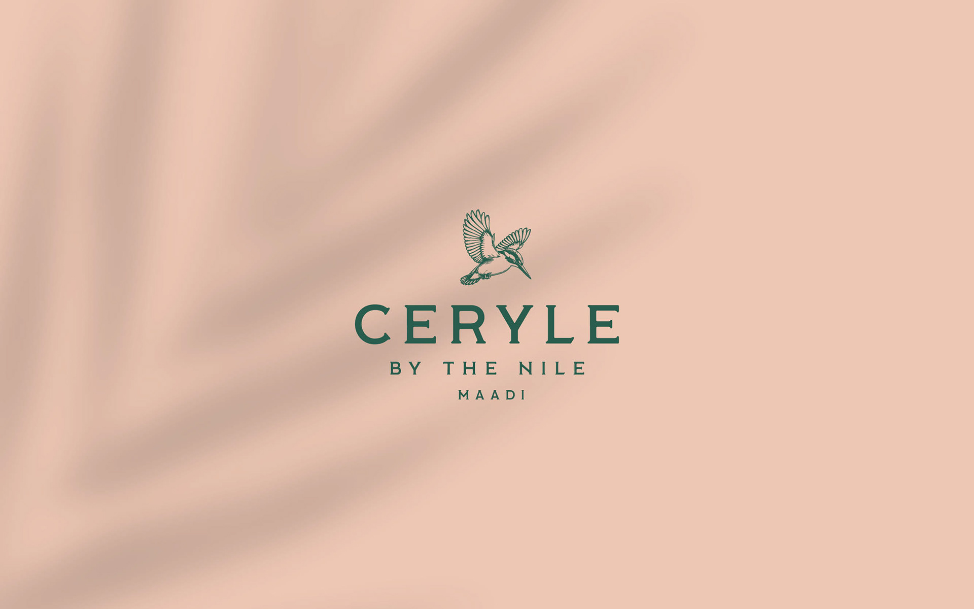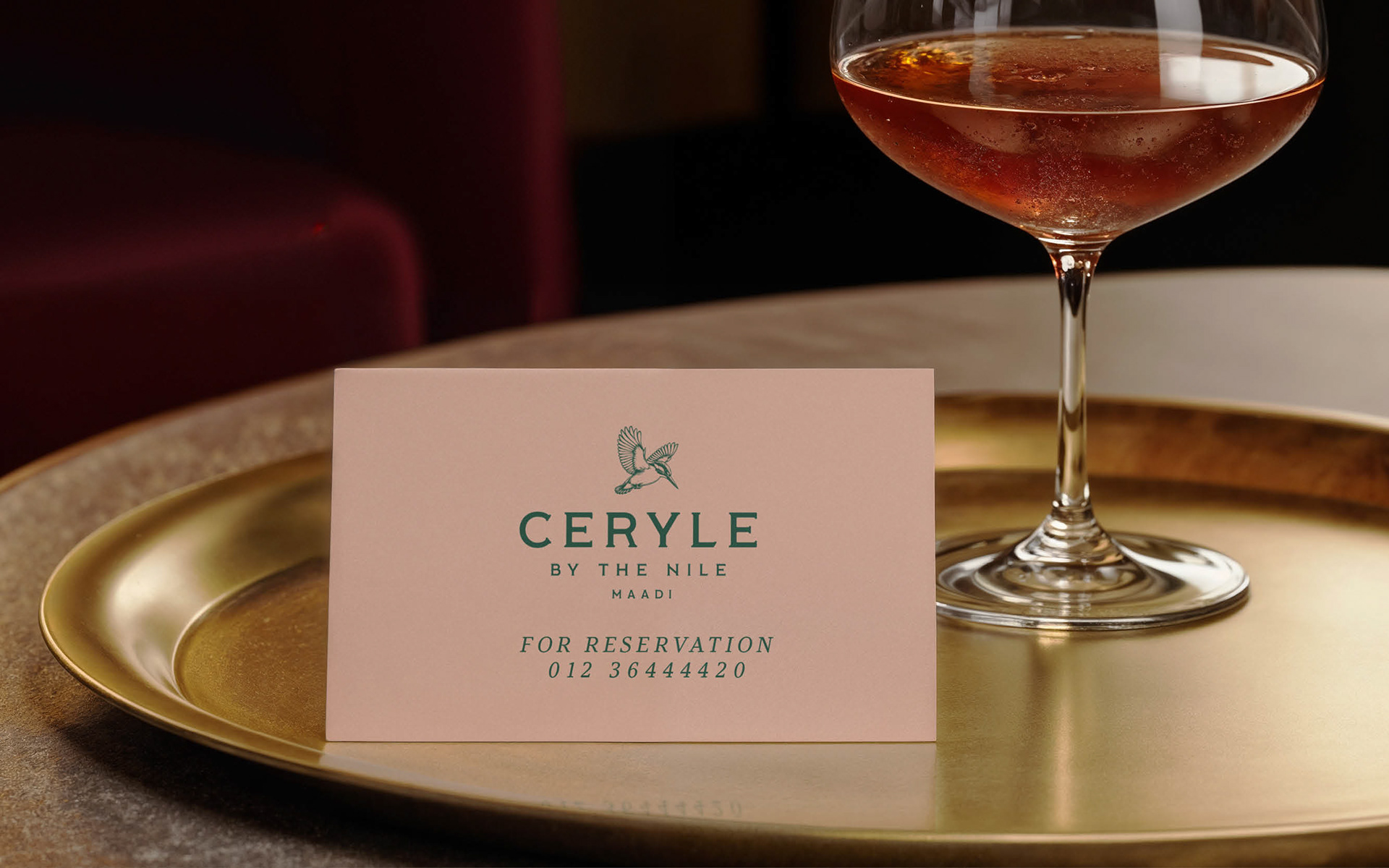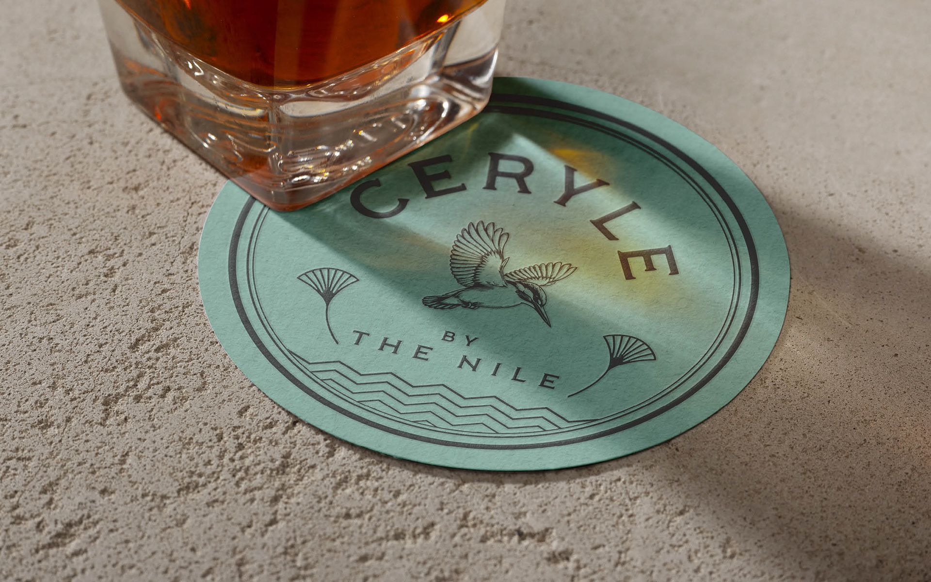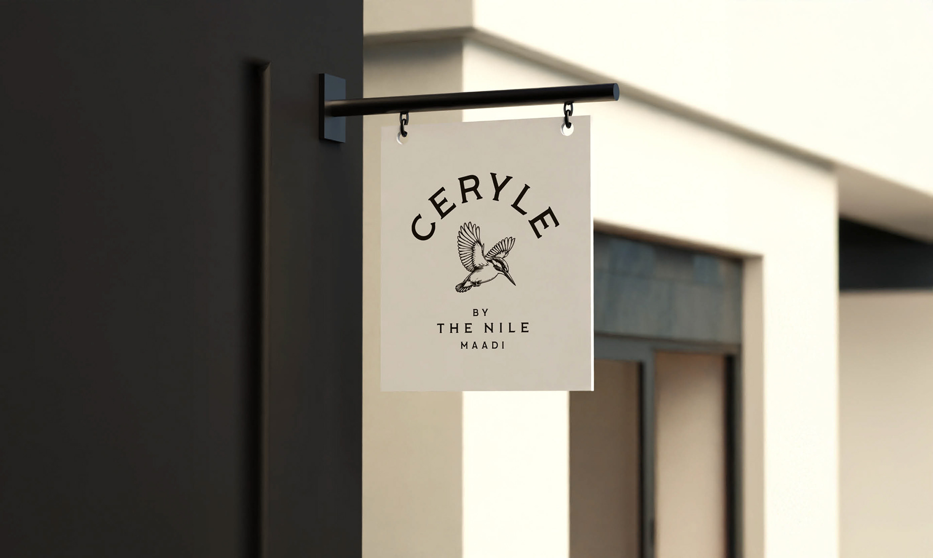 Branding for Ceryle By The Nile, a sophisticated Nile-side venue in Maadi. The Pied Kingfisher (Ceryle Rudis) is a highly recognizable and common resident breeding bird throughout Egypt, particularly along the Nile River.