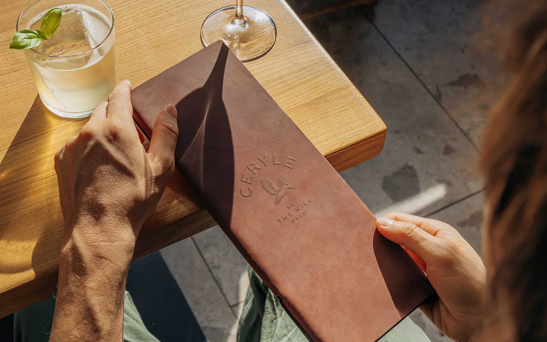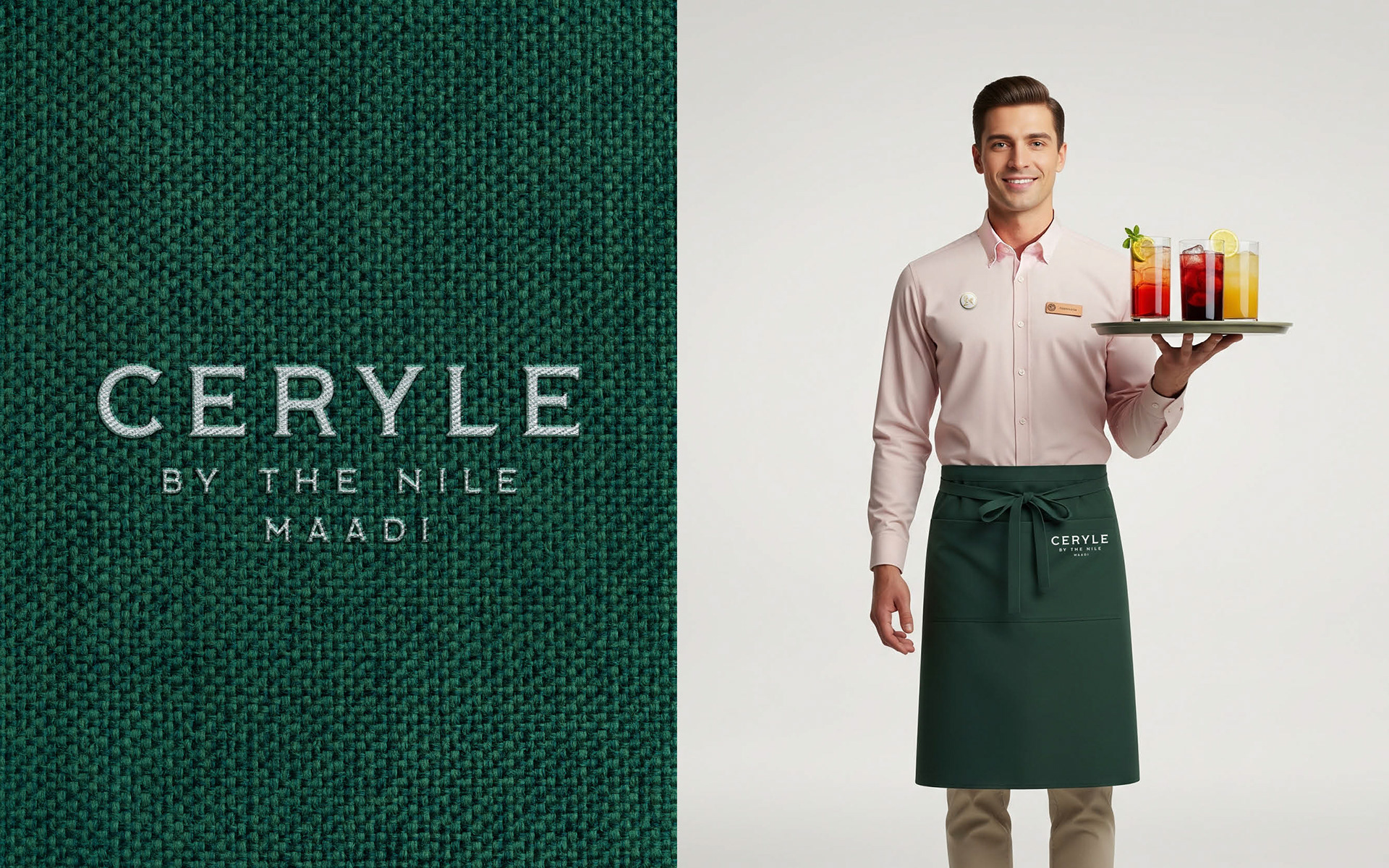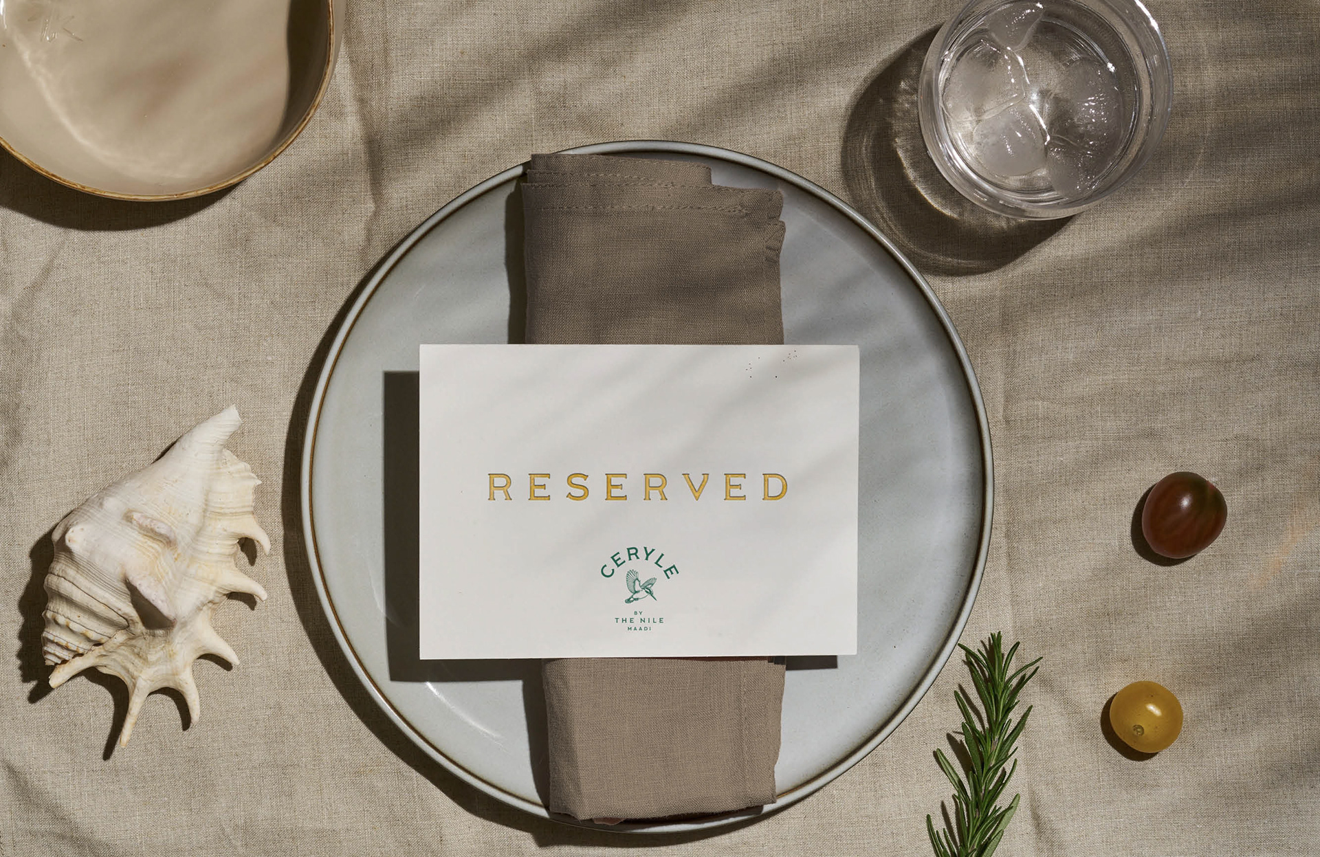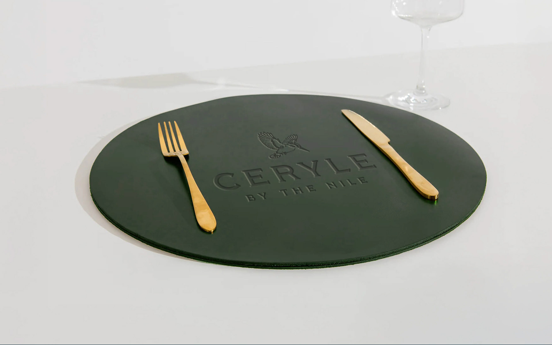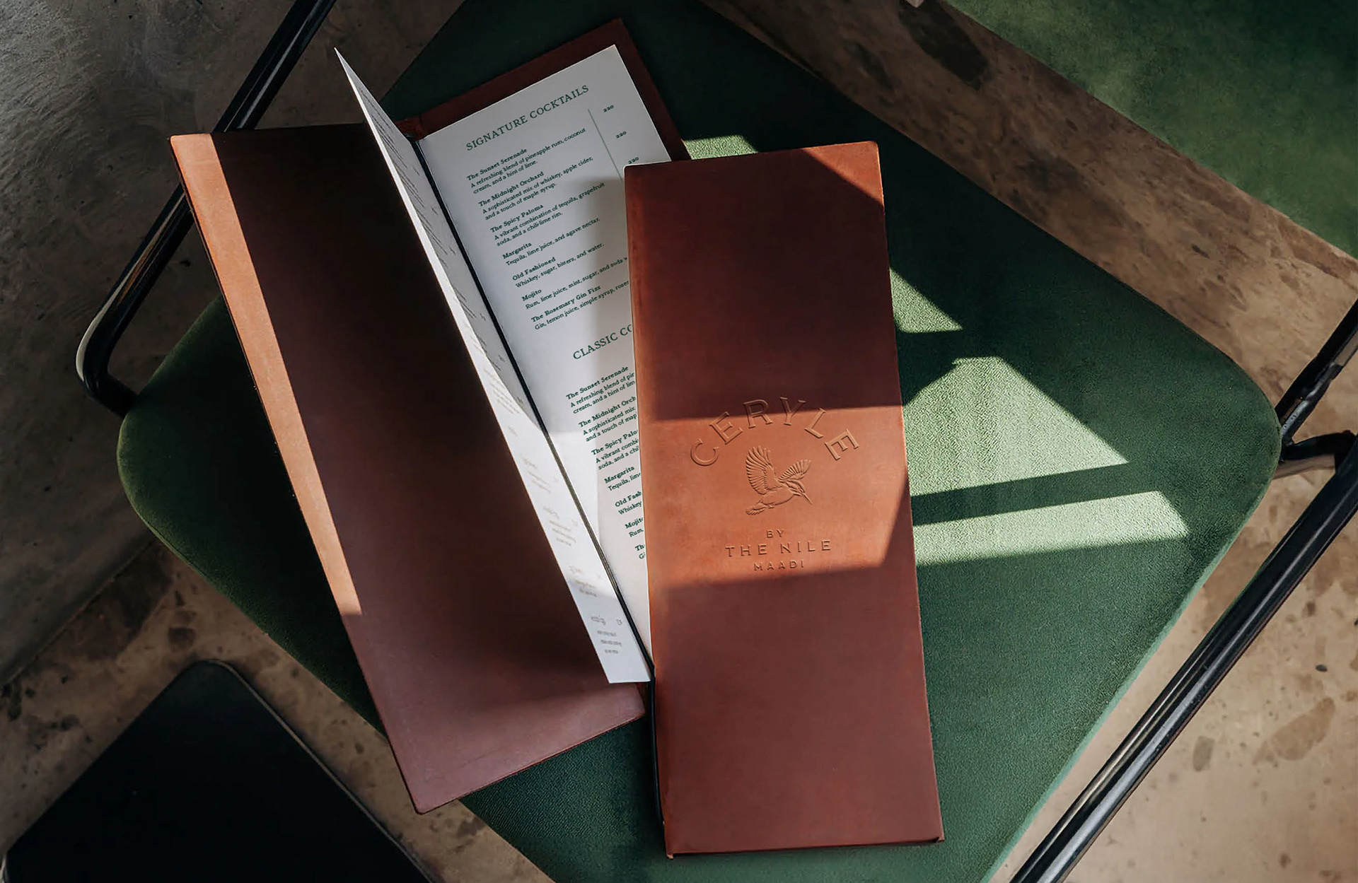 Branding for Ceryle By The Nile, a sophisticated Nile-side venue in Maadi. The Pied Kingfisher (Ceryle Rudis) is a highly recognizable and common resident breeding bird throughout Egypt, particularly along the Nile River.